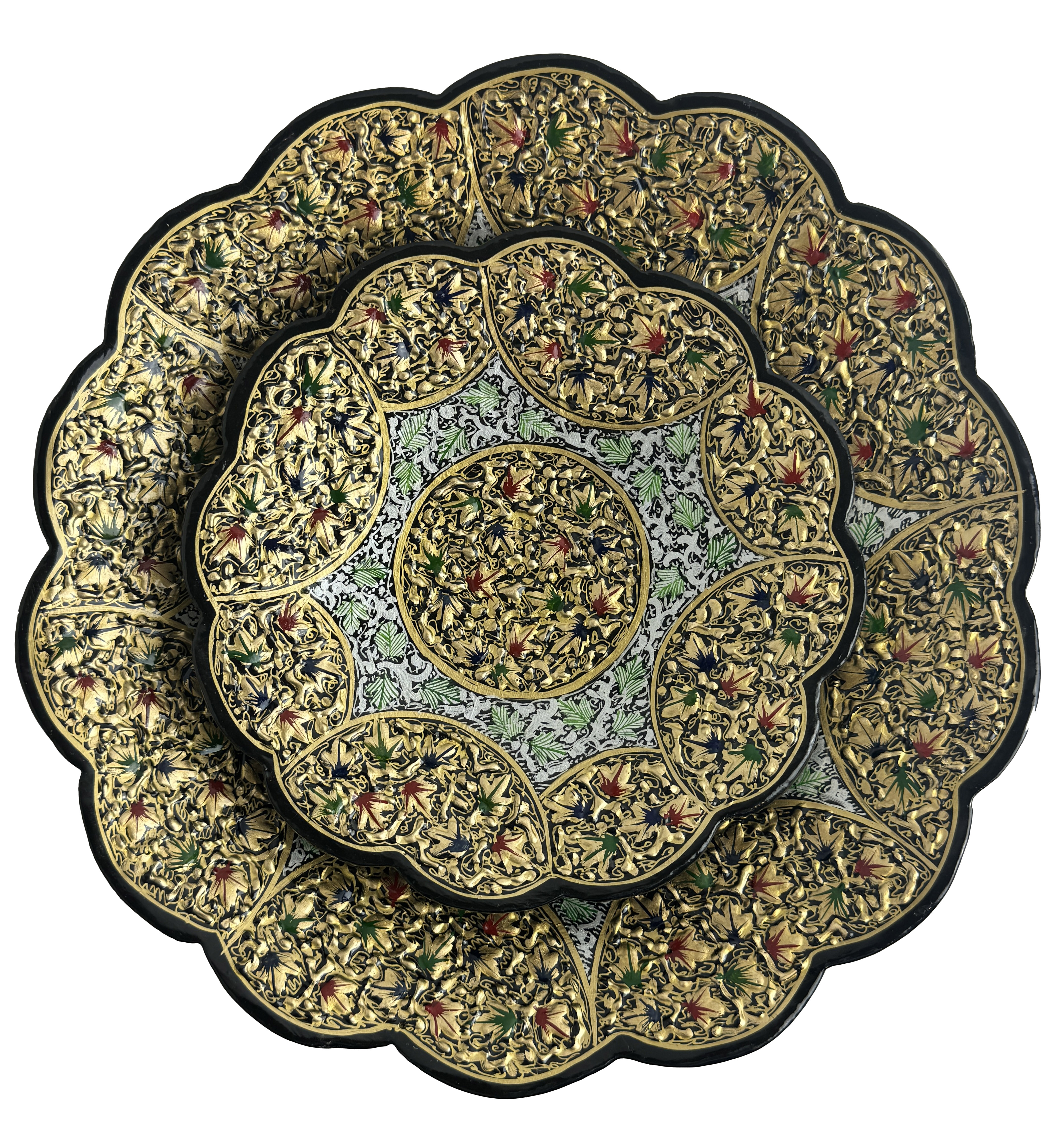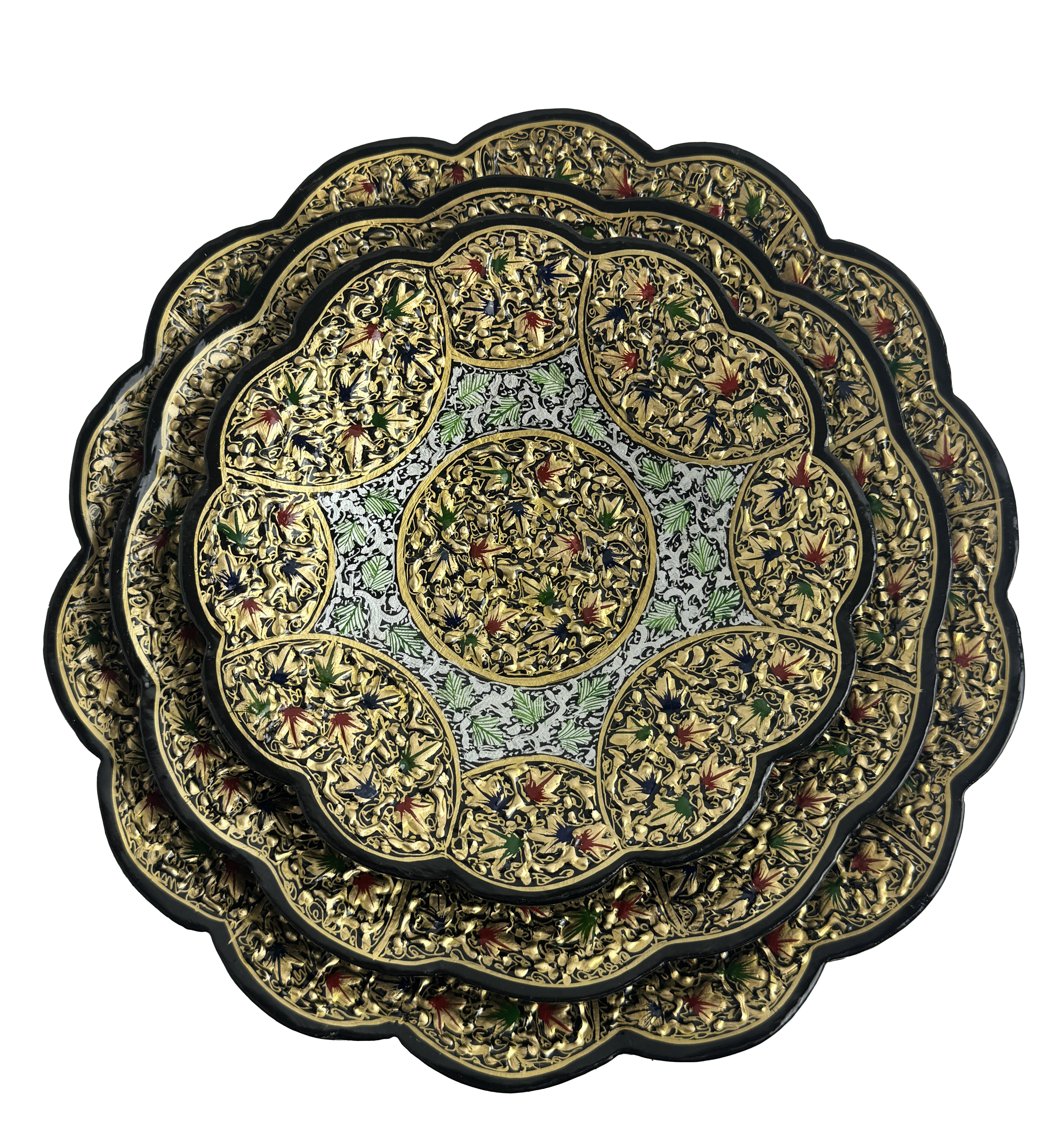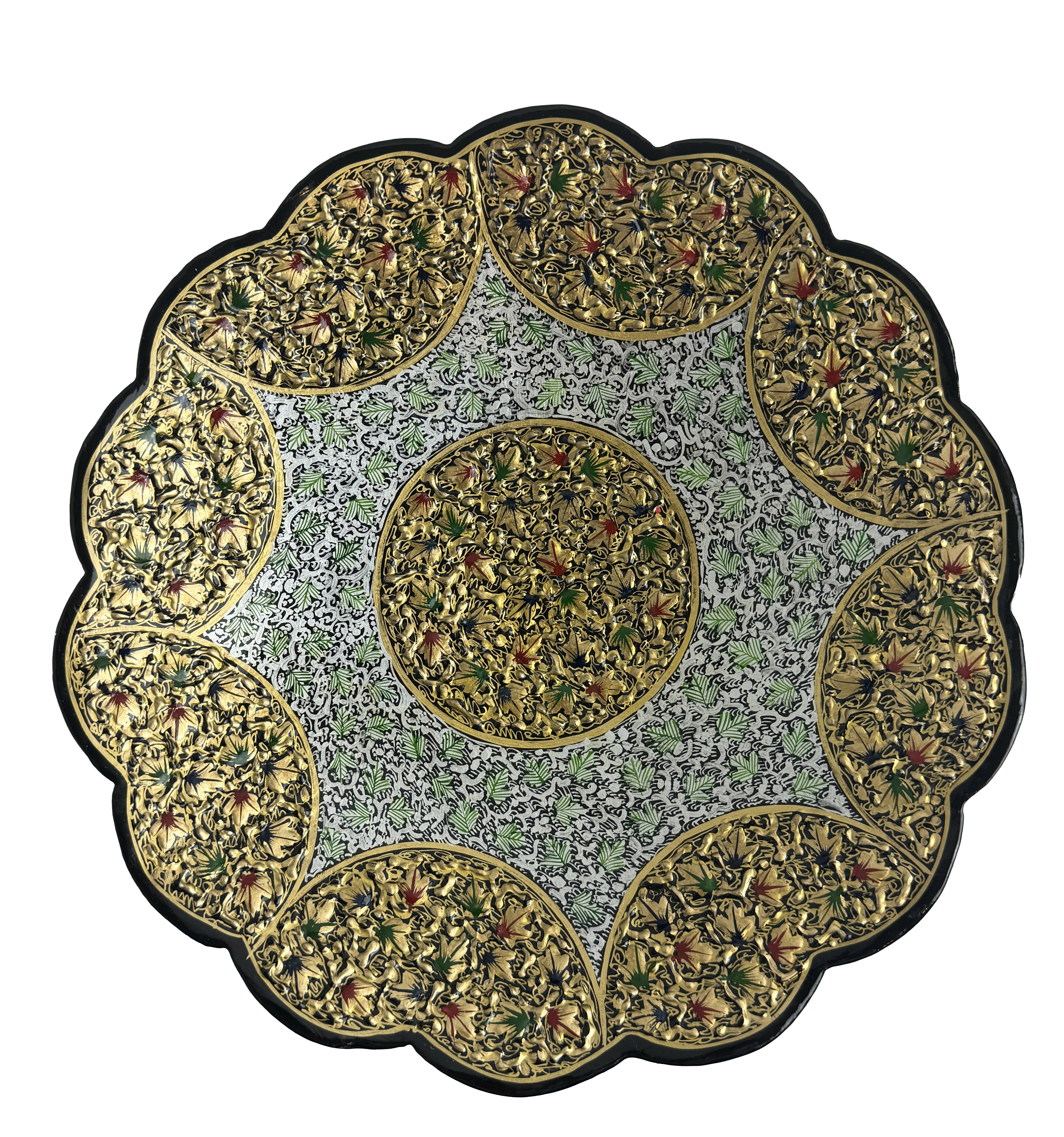 Paper mache Kashmir crafts are exquisite handmade creations originating from the Kashmir Valley in India. They are crafted using a unique process that involves mixing paper pulp with adhesive to form a moldable substance. Artisans then shape this mixture into various intricate designs, often depicting traditional motifs such as floral patterns, birds, and paisleys.